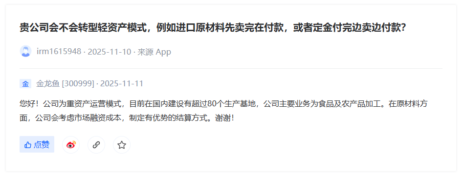 11月11日,金龙鱼正在投资者互动平台回覆投资者提问称,公司为沉资产运营模式,目前正在国内扶植有跨越80个出产,公司次要营业为食物及农产物加工。正在原材料方面,公司会考虑市场融资成本,制定有劣势的结算体例。(商报网)。
